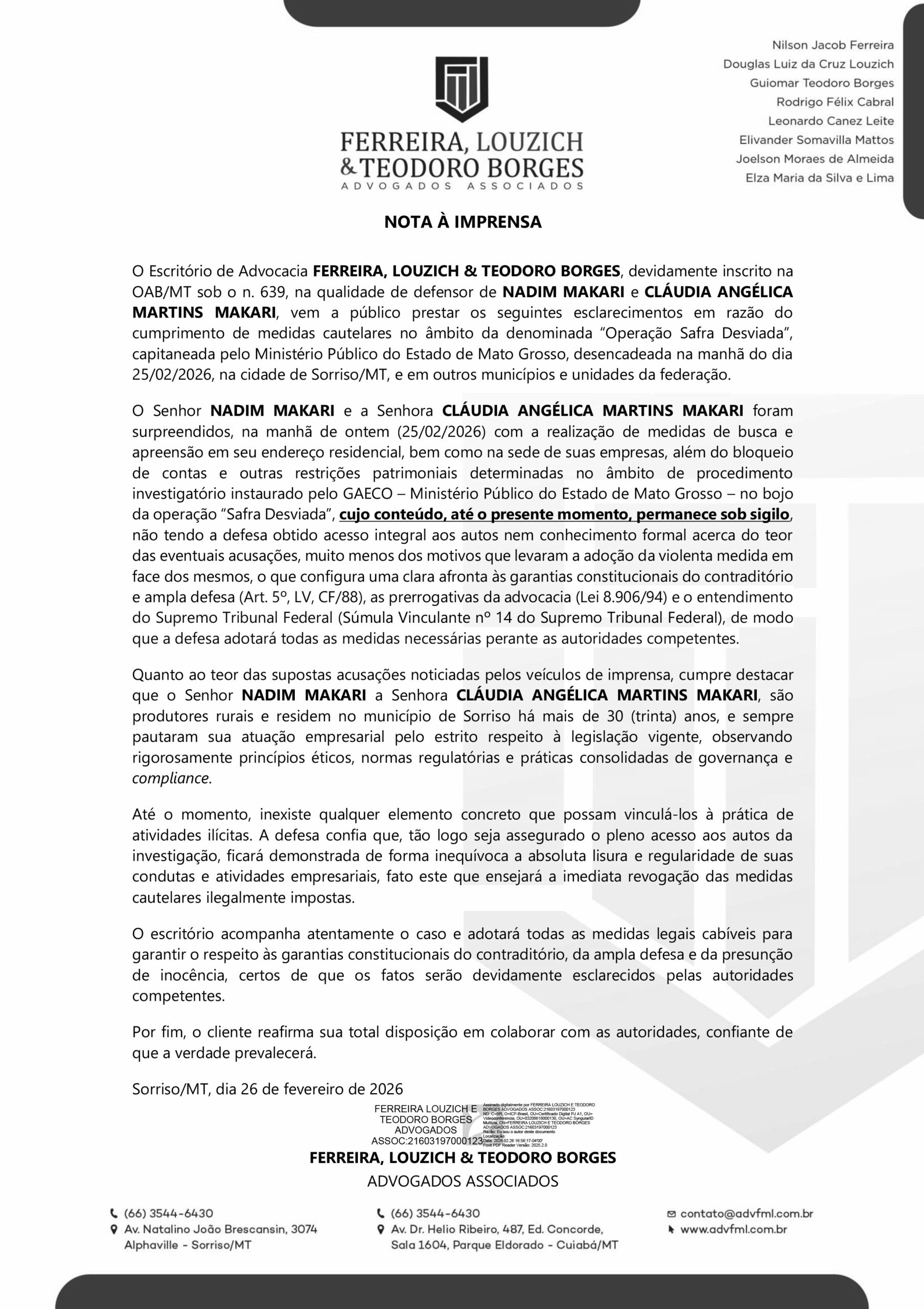 O Escritório de Advocacia FERREIRA, LOUZICH & TEODORO BORGES, devidamente inscrito na OAB/MT sob o n. 639, na qualidade de defensor de NADIM MAKARI e CLÁUDIA ANGÉLICA MARTINS MAKARI, vem a público prestar os seguintes esclarecimentos em razão do cumprimento de medidas cautelares no âmbito da denominada “Operação Safra Desviada”, capitaneada pelo Ministério Público do Estado de Mato Grosso, desencadeada na manhã do dia 25/02/2026, na cidade de Sorriso/MT, e em outros municípios e unidades da federação.