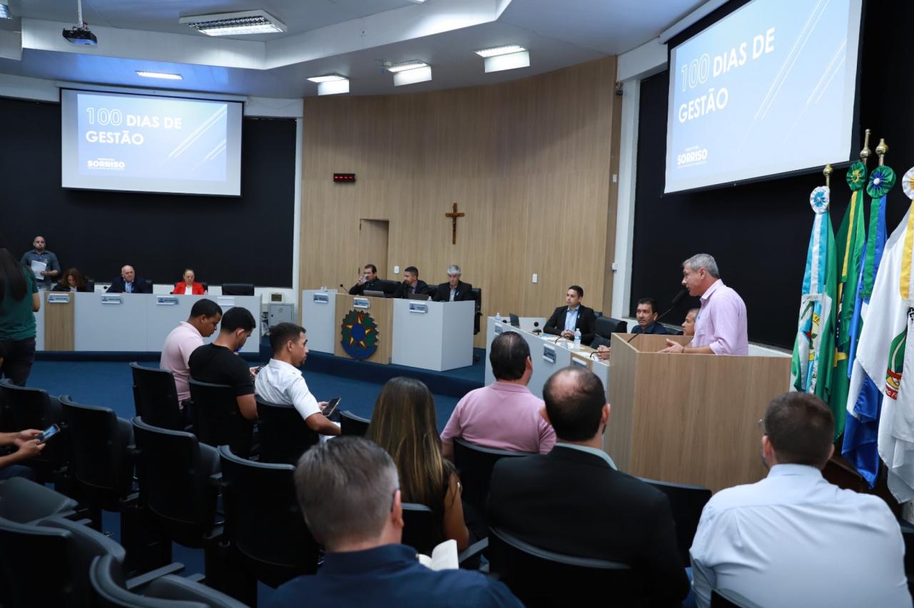 O prefeito de Sorriso, Alei Fernandes, esteve na Câmara de Vereadores, nesta sexta-feira (25), para apresentar o balanço dos seus primeiros 100 dias de gestão à frente do Executivo Municipal. Em um discurso marcado por agradecimentos, metas e prestação de contas, o gestor destacou que administrar um município pujante como Sorriso é um grande desafio, mas que vem sendo superado com trabalho, transparência e união entre os poderes.