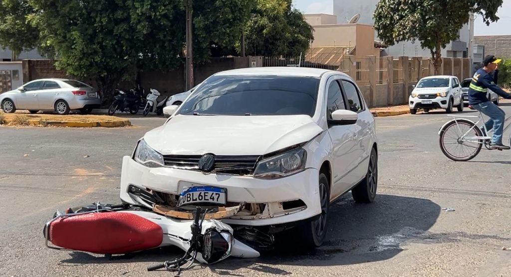 Um grave acidente de trânsito foi registrado no início da tarde desta sexta-feira (5), no cruzamento das ruas Vale Dourado e Inivaldo Bedin, em Sorriso. A colisão envolveu um veículo Gol, de cor branca, e uma motocicleta Honda.