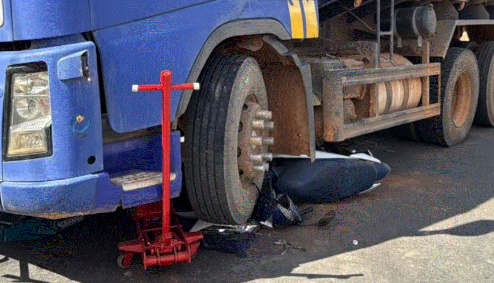A motocicleta ficou presa sob uma das rodas do caminhão, apresentando danos significativos, como no painel, retrovisores e farol. A Polícia Rodoviária Federal esteve no local para controlar o tráfego e dar andamento às investigações.