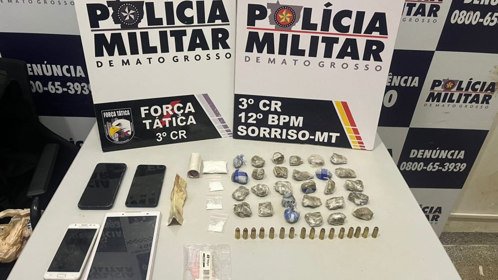 Durante mais uma etapa da Operação Tolerância Zero, a Polícia Militar de Sorriso apreendeu entorpecentes, munições e celulares em uma residência no bairro Rota do Sol, que estaria sendo utilizada como ponto de venda de drogas. Dois suspeitos – um homem de 24 anos e uma mulher de 23 – foram presos na noite de segunda-feira (15) por tráfico de drogas e posse irregular de munição de calibre permitido.