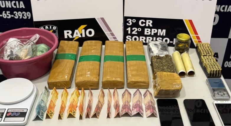 Durante patrulhamento tático no bairro São Mateus, em Sorriso, a equipe RAIO do 12º Batalhão da Polícia Militar de Mato Grosso apreendeu, nesta terça-feira (15), mais de 5,6 quilos de drogas e 100 munições de calibre .357 Magnum. A ação integra as operações Tolerância Zero e Vitae, voltadas ao combate à criminalidade na região.