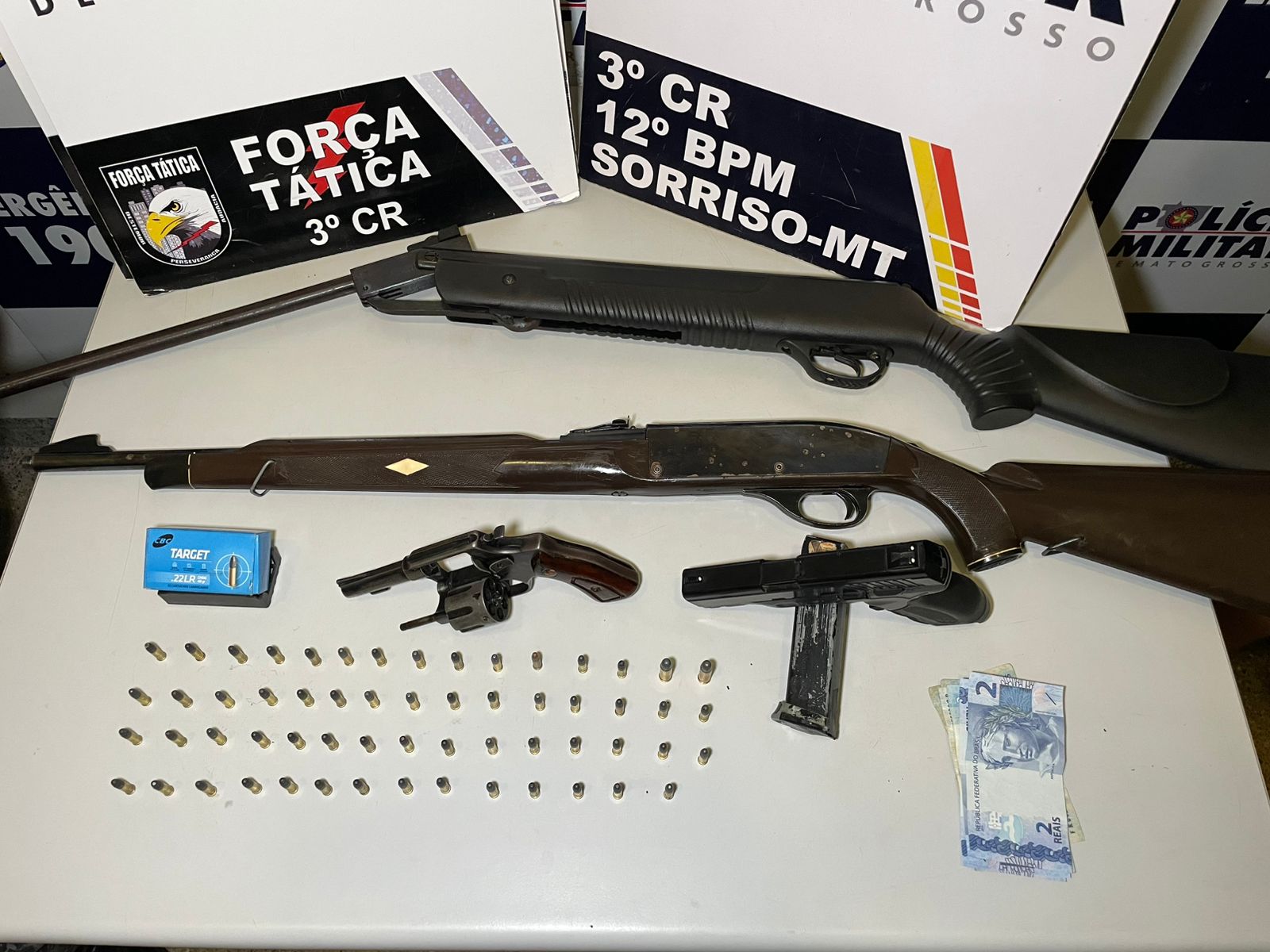 Pai e filho foram detidos pela Polícia Militar de Sorriso, por meio da equipe da Força Tática, na noite desta segunda-feira (15), após a apreensão de armas de fogo, um simulacro e diversas munições. A ação teve início após denúncias anônimas informarem que armamentos estavam sendo exibidos em postagens nas redes sociais.