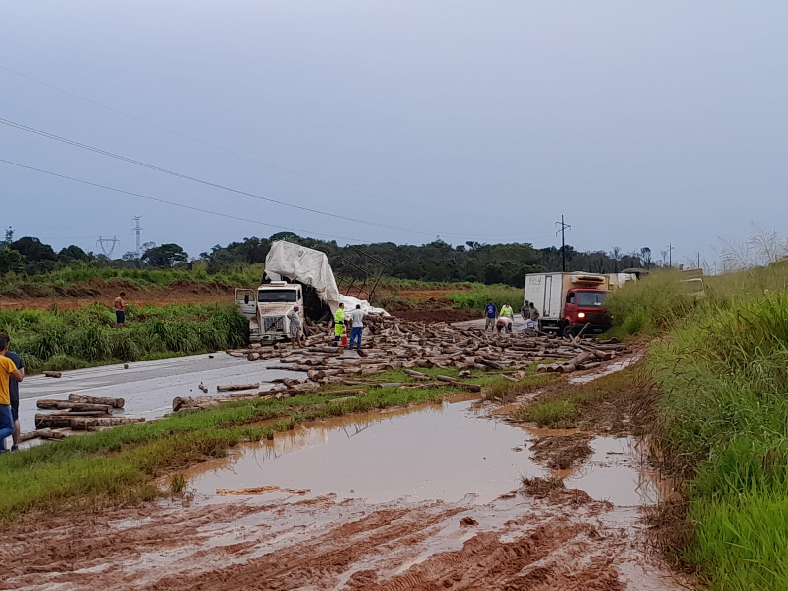 Sorriso: Caminhão derrama carga de madeira na BR-163 e mobiliza equipes de resgate