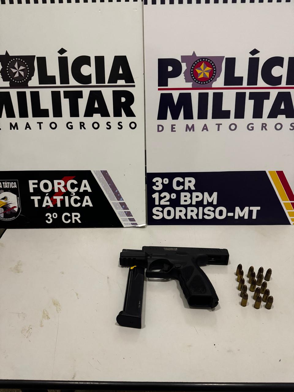 No decorrer dos procedimentos, durante a busca pessoal, os policiais localizaram uma pistola calibre 9mm, da marca Taurus, modelo TS9, além de 18 munições intactas e um carregador.